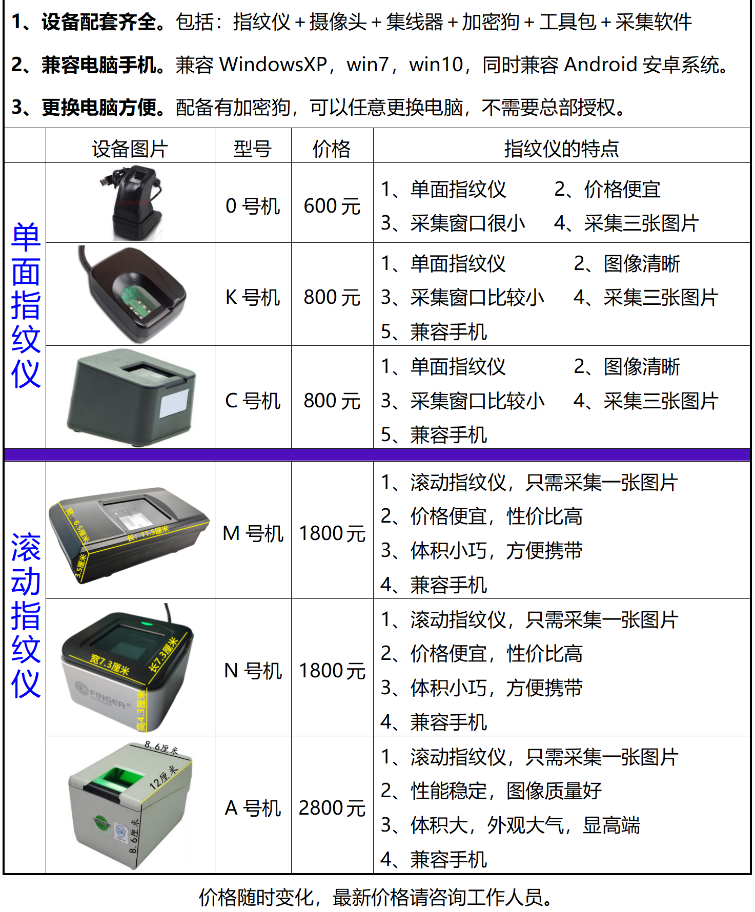 - 设备功能:单面指纹仪、滚动指纹仪、掌纹仪