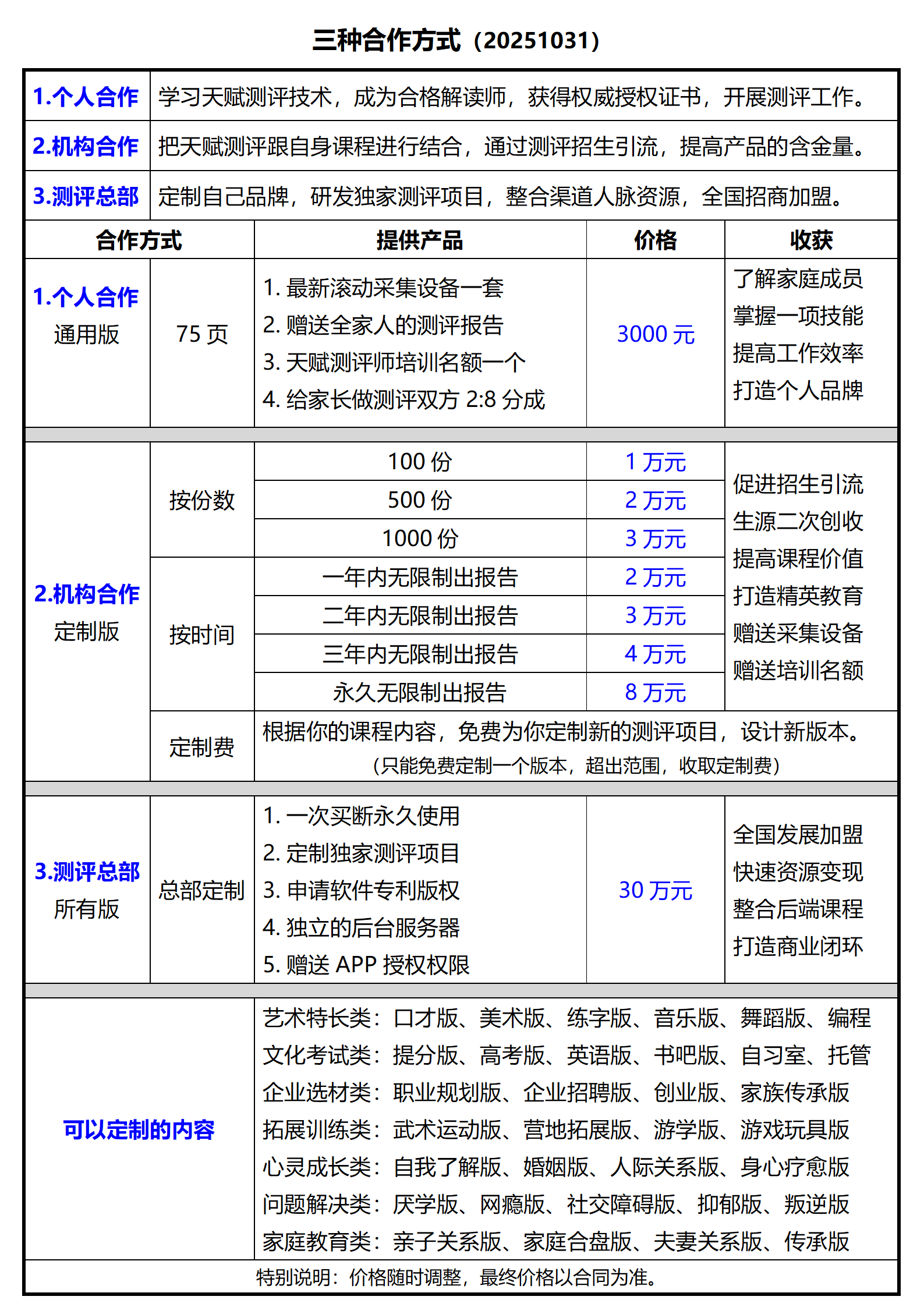 | 个人加盟 | 以学习为主。适合:学校老师、个人创业、生涯规划师、心理咨询师、家庭教育师。 |
